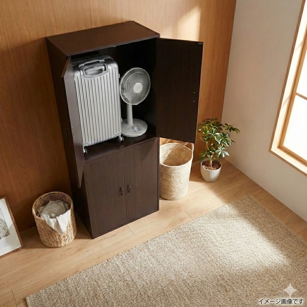 2台を縦にも横にも設置することが可能です。 どんどん増える座布団の指定場所を作りました。 シーズンオフの衣類や扇風機のような家電など 家中の物を整理する大型収納庫としても大活躍。 仕分け収納に便利な高さ調節可能の移動棚付き。 和室・洋室どちらにも合う木目調のデザインです。
